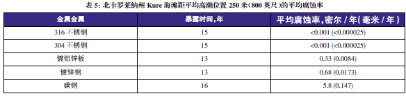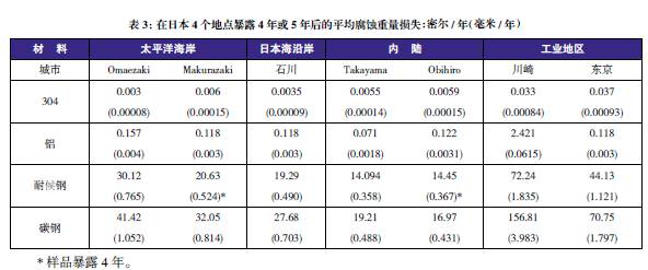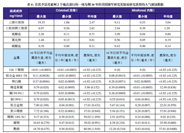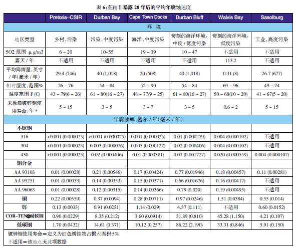 表3至表6的數(shù)據(jù)來(lái)自于日本、巴拿馬、Kure 海灘(北卡萊羅納州)和南非的試驗(yàn)地點(diǎn)。可利用這些數(shù)據(jù)在類(lèi)似環(huán)境中選擇適當(dāng)?shù)慕饘俨牧希M(jìn)行生命周期成本分析。